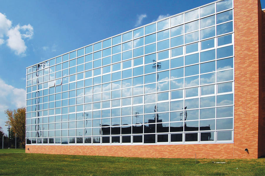 Stick Curtain Wall System is shipped in pieces for field-fabrication or assembly. These can be furnished as “stock lengths” to be cut, machined, assembled, and sealed in the field, or as “knocked down” (KD) parts pre-machined in the factory, for field assembly and sealing only. All stick curtainwalls are field-glazed. Frame assembly requires the use of either, a) “shear blocks” to connect vertical and horizontal framing elements, or b) “screw-spline” construction, in which assembly fasteners feed through holes in interlocking vertical stacking mullions into extruded races in horizontals.